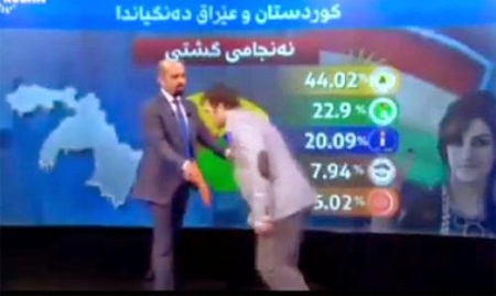وكان الخبير الضيف واقفاً أمام مقدم برنامج على تلفزيون "روداو” الذي يبث برامجه من مدينة أربيل، عاصمة كردستان العراق، حيث غطت القناة لمدة 24 ساعة دون توقف العملية الانتخابية.