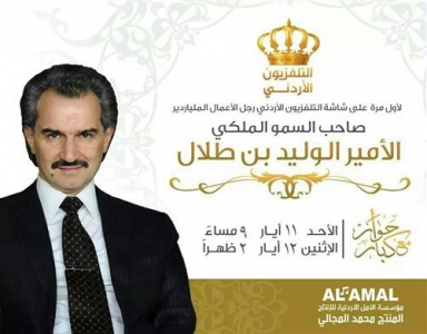 يستضيف التلفزيون الاردني في مقابلة خاصة الامير وليد بن طلال بن عبد العزيز . وستبث حلقة (برنامج حوار مع الكبار) للمنتج محمد المجالي يوم الاحد 11 ايار المقبل عند الساعة التاسعة مساء ، فيما سيعاد بث الحلقة في اليوم التالي (الاثنين) عند الساعة الثانية بعد الظهر. ويتحدث الامير الوليد عن جملة من القضايا المتعلقة بفكره للاعمال المالية ورؤيته للاقتصاد. كما سيتطرق في حديثه عن مشاريعه الاعلامية، ومن بينها فضائية العرب التي ستبث من المنامة العاصمة البحرينية حيث سيعلن عن موعد انطلاقها. وستبدأ الاذرع الاعلامية المنتشرة والتابعة للامير الوليد ببث دعايات خاصة بالبرنامج والترويج للحلقة التي ستذاع عبر التلفزيون الاردني. يذكر أن الامير بن طلال زار الاردن مؤخراً وتسلم في حفل حضرته جلالة الملكة شهادة الدكتوراة الفخرية من الجامعة الاردنية، قبل أن يخص برنامج "حوار مع كبار" بالمقابلة الحصرية .