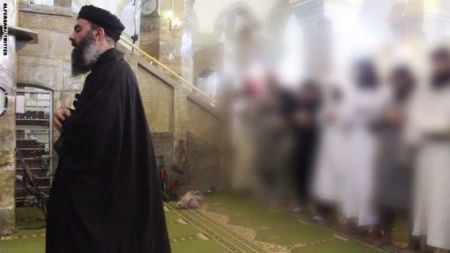 رم - برر تنظيم الدولة الإسلامية بالعراق والشام أو ما يُعرف بـ'داعش' ظهور من زعمت أنه أبوبكر البغدادي الذي وصفته بـ'خليفة المسلمين،' بعمامة وملابس سوداء خلال خطبة الجمعة بمسجد بالموصل بأنه اقتفاء بالنبي محمد.