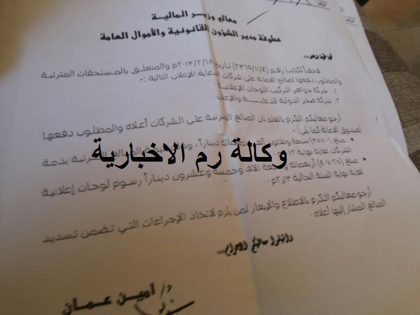 وصلت رم صورة عن كتاب صادر عن امانة عمان الكبرى يطالب بها شركتي جواهر لتركيب اللوحات الاعلانية و صخر الدولية للدعاية والاعلان بدفع مبلغ 37800 دينار وذلك قيم المبالغ المترتبة على الشركتين لغاية 2012 و دفع مبلغ 405025 دينار بدل رسوم لوحات اعلانية لغاية نهاية 2013 .