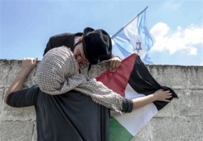 تداولت العديد من الصفحات على مواقع التواصل الاجتماعي صورة يظهر فيها رجل يهودي الشكل، يحمل العلم الإسرائيلي وهو يقبل من فوق الحائط امرأة محجبة، تحمل علماً فلسطينياً.