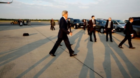 ويرافق كيري مساعد مدير مكتبه جوناثان فاينر وكبير مستشاريه ديفيد ثورن والمتحدثة باسم الخارجية الأمريكية جين ساكي.رويترز