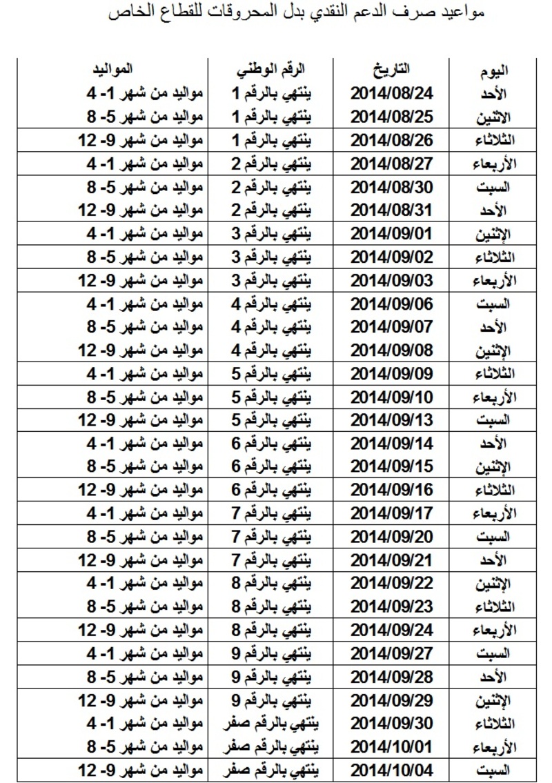وقالت الدائرة في انه صرف الدعم سيستمر ثلاثة ايام لارباب الاسر المستحقين في القطاع الخاص ممن تنتهي ارقامهم الوطنيه بالرقم واحد ومن مواليد اشهر كانون الثاني وشباط واذار ونيسان ومن الساعة الثالثة ظهرا وحتى الساعة السابعة مساءا في فروغ بنك الاسكان