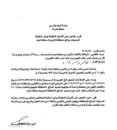 الحجز على الأموال المنقولة وغير المنقولة للمعتدين على المياه - وثائق