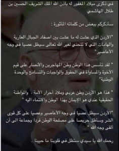 جلالة الملكة نور الحسين – زوجة الحسين بن طلال – غردت على تويتر مساء أمس وباللغة الانجليزية ' Happy birthday beloved.Thank u 4 ur loving heart &inspiring exmple of humanity,integrity&dedicated compassionate,principled leadershipRIP”.