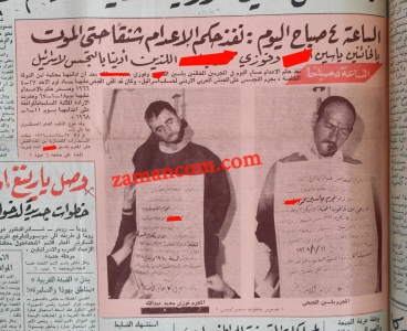 التنفيذ تم في ساحة سجن عمان المركزي. وترون في الصورة إلى أعلى الخبر ويتضمن صورة الجاسوسين  معلقين على حبل المشنقة.