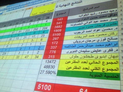 وحصل حتى اللحظة الرجوب على 5165 صوتا مقابل 4449 صوتا للمرشح يسار الخصاونة.