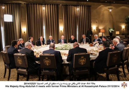 وشمل اللقاء رؤساء الوزراء السابقين: مضر بدران، زيد الرفاعي، أحمد عبيدات، طاهر المصري، عبدالكريم الكباريتي، علي أبوالراغب، فيصل الفايز، الدكتور عدنان بدران، الدكتور معروف البخيت، سمير الرفاعي وعون الخصاونة؛ كما حضره رئيس الوزراء الدكتور عبدالله النسور، رئيس مجلس الأعيان الدكتور عبدالرؤوف الروابدة، رئيس الديوان الملكي الدكتور فايز الطراونة، مدير مكتب الملك الدكتور جعفر حسان.