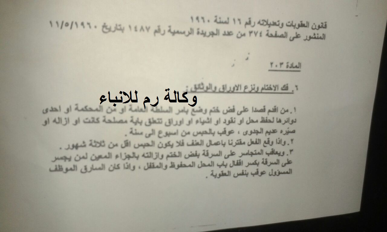 ولدى اتصاله بالمسؤول وااسمه لدى الراي نيوز اجابه بانه سيسجنه ان ازال الختم . ما هو الحل معالي السيد هاني الملقي وما هي نوعية مثل هذه اﻻجراءات .