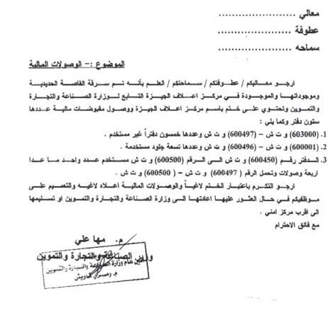 وعممت وزيرة الصناعة مها علي على جميع الوزارات والمؤسسات الحكومية باعتبار الاختام والوصولات المالية المسروقة لاغية تماماً