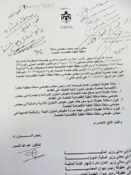 - قرر مجلس الوزراء الأحد، الموافقة على إحالة اثنين من أعضاء مجلس مفوضي العقبة الاقتصادية الخاصة، للتقاعد واثنين آخرين وافق على قبول استقالتهم.