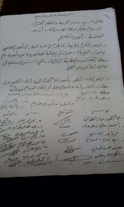 وبين المصححون في المذكرة التي أرسلت لمعالي وزير التربية والتعليم ، الخميس 9/7/2015م ، أنه قد 'تم إضافة مهمة جديدة غير مأجورة، وهي مرحلة التفتيش والمطابقة الثالثة، والتي استنزفت منا حوالي يومين إضافيين من العمل '.