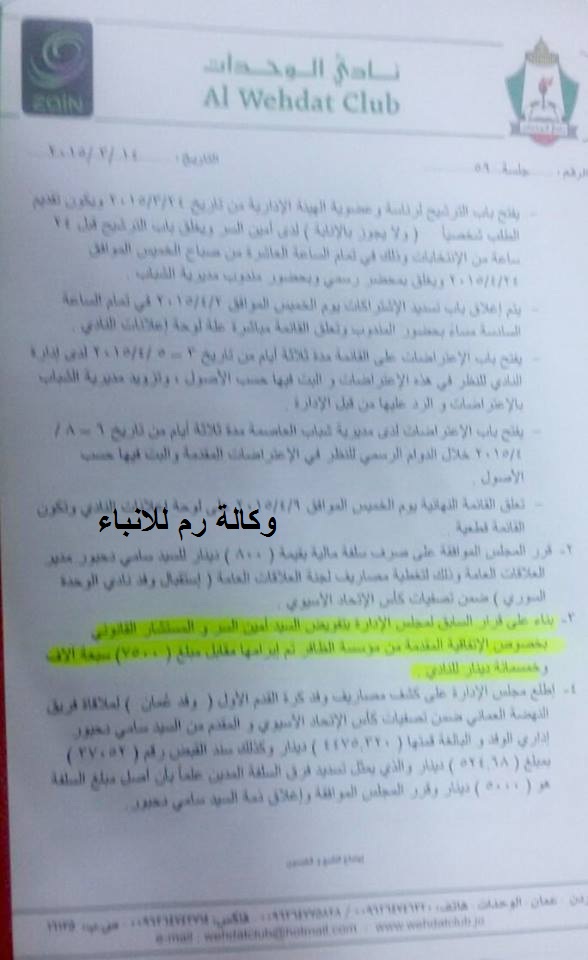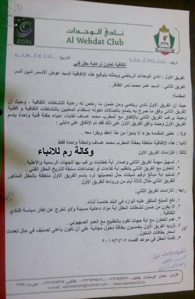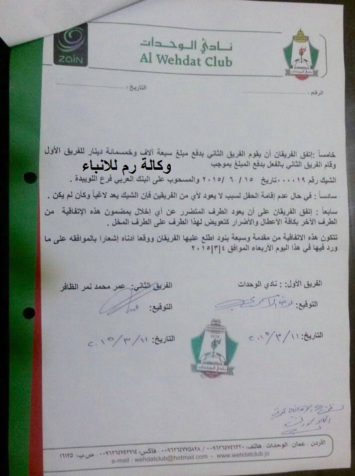 وتاليا نرفق صورا عن توقيع الاتفاقية ونسخة من العقد الموقع ما بين المنظم للحفل ونادي الوحدات :