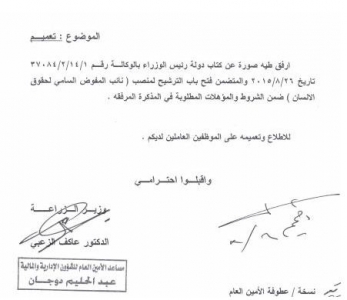 وعمم الوزراء على الموظفين لمن يرغب بالترشح لهذا المنصب في الفترة الحالية.