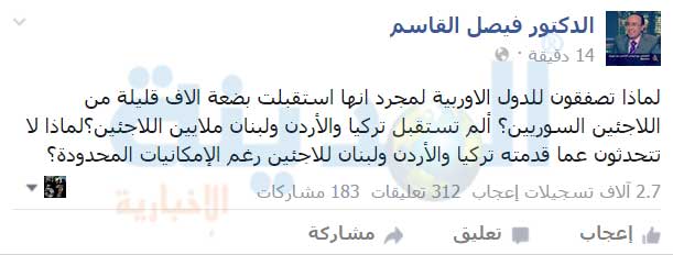 : انتقد الاعلامي السوري الشهير فيصل القاسم مدح الدول الاروبية لاستضافتها الاف قليلة من اللاجئين السوريين ، في حين يستقبل الاردن وتركيا ولبنان الملايين منهم . وقال القاسم في منشور له الاحد عبر موقع فيسبوك " لماذا تصفقون للدول الاوربية لمجرد انها استقبلت بضعة الاف قليلة من اللاجئين السوريين؟ ألم تستقبل تركيا والأردن ولبنان ملايين اللاجئين؟لماذا لا تتحدثون عما قدمته تركيا والأردن ولبنان للاجئين رغم الإمكانيات المحدودة؟ " . شاهدوا المنشور