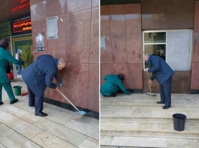 رصدت عدسة هاتف أحد طلبة الجامعة الأردنية انهماك مدير المكتبة د. مهند مبيضين بمساعدة عمال الوطن بتنظيف مرافق المكتبة ومحيطها قبل دخول مكتبه صباح اليوم الأحد.