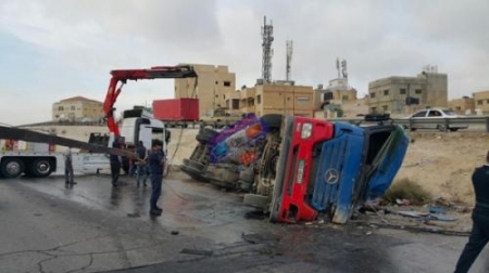 انقلاب صهريج مياه عادمة على اوتوستراد المفرق الزرقاء .. صور
