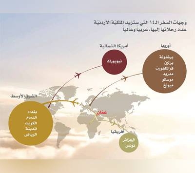 قررت شركة الخطوط الجوية الملكية الأردنية زيادة عدد رحلاتها إلى 14 مدينة عربية وعالمية على شبكتها الجوية إعتباراً من موسم الصيف المقبل .