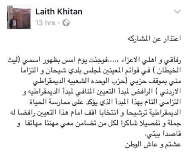 رفض ليث الخيطان قرار مجلس الوزراء الصادر بتنسيب من وزير البلديات بتعيينه عضوا في مجلس بلدي شيحان بمحافظة الكرك.