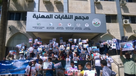 اعتصم اليوم السبت العشرات من أهالي ومناصري نشطاء يحاكمون في محكمة أمن الدولة، أمام مجمع النقابات المهنية في عمان، مطالبين بالإفراج الفوري عنهم.