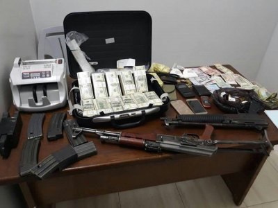 واضافت ادارة العلاقات العامة والاعلام انه وقبل ايام جرى ملاحقة ذلك المطلوب اثناء تواجده في مركبة له الا انه تمكن حينها من الفرار على الاقدام بعد تركه للمركبة ، وضبط داخل تلك المركبة عند تفتيشها سلاحين ناريين اتوماتيكيين اضافة الى كمية من المواد المخدرة وحقيبة تحوي رزم اوراق بيضاء على بحجم الدولار وكمية من الدولارات الحقيقية والتي توضع فوق الرزم البيضاء من اجل اتمام عمليات الاحتيال بطريقة بيعه سعر اقل من السوق كما وتم في حينه التوجه لمنزل ذلك المطلوب وبتفتيشه عثر كذلك على سلاح ناري (مسدس ) وكمية من المواد المخدرة .