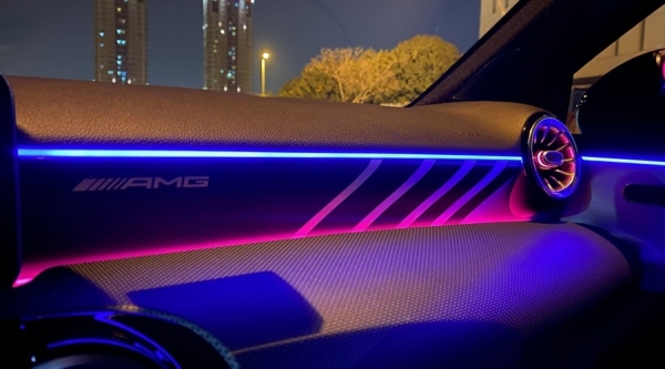 طبعا لمسات AMG واضحة في كل مكان من المقود الى الكونسول الى المقاعد الى الشاشة وحتى الدعسات والسجاد وفي الخارج الأمور أجمل وأحلى فوجود اللون الأسود اللامع يعطي السيارة طابعا رياضيا فريدا خاصة مع إضافات AMG على المصدين الامامي والخلفي ووجود مخرجين للعوادم. ولعل ما لفت انتباهي في المقدمة هو وجود خطين من الألومنيوم داخل الشبك لتعطي الواجهة طابعا هجوميا.