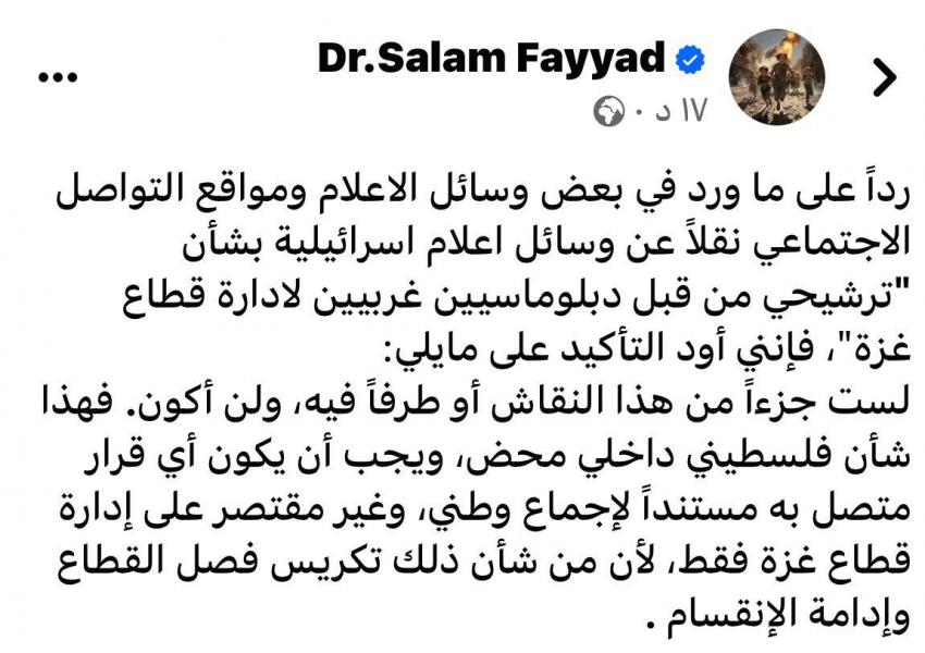 الرأي نيوز  - نفى رئيس الحكومة الفلسطينية السابق، سلام فياض، أن يكون جزءاً من نقاش غربي حول "إدارة قطاع غزة"، حيث قال: أنا لست جزءاً من نقاش غربي حول "إدارة قطاع غزة" أو طرفاً فيه، ولن أكون.