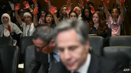 وقاطع محتجون غاضبون بلينكن عندما بدأ شهادته أمام لجنة العلاقات الخارجية بمجلس الشيوخ التي يسيطر عليها الديمقراطيون. وترددت هتافات منها "يداه ملطختان بالدماء"، و"مجرم حرب"، و"جزار غزة" و"يداك ملطختان بدماء 40 ألف فلسطيني"، وتراجع بلينكن عن محتجة اقتربت من ورائه وهي تلوح بلافتة كتب عليها "مجرم" قبل أن يخرجها أفراد أمن من القاعة.