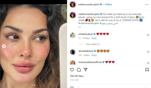 وعلَّقت نادين نسيب نجيم على الصورة:"مكياج بدون مكياج، هما سري اليومي، استخدم منتجي الخاص للمسة ناعمة من اللمعان، من الشفاه حتى الخدود.. لا يمكنني الانتظار لتقومي بتجربته قريباً