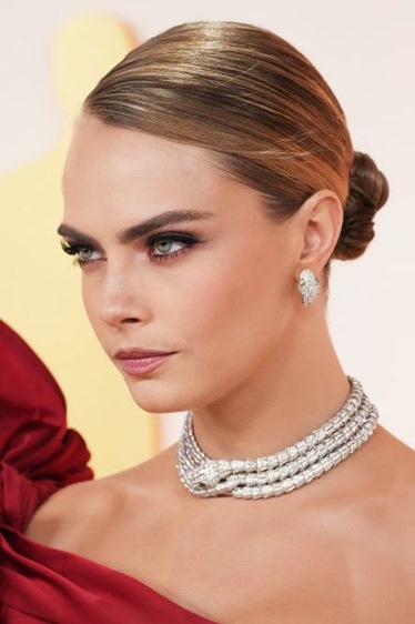 كانت كارا ديليفين صورة للأناقة في فستانها من إيلي صعب مع كعكة أنيقة منخفضة ومكياج رومانسي يتميز باللون الوردي