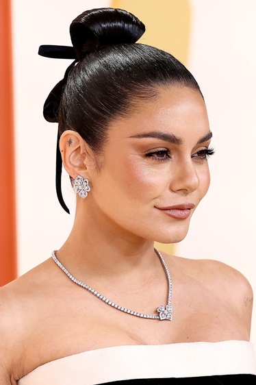 جلبت لنا فانيسا هادجنز مزيدًا من الإلهام لاتجاه قوس الشعر، حيث ارتدت شريطًا أسودًا مربوطًا حول حلقة أنيقة. تميز مكياجها بلوحة ألوان محايدة صامتة تتماشى مع فستان شانيل أحادي اللون من الستينيات