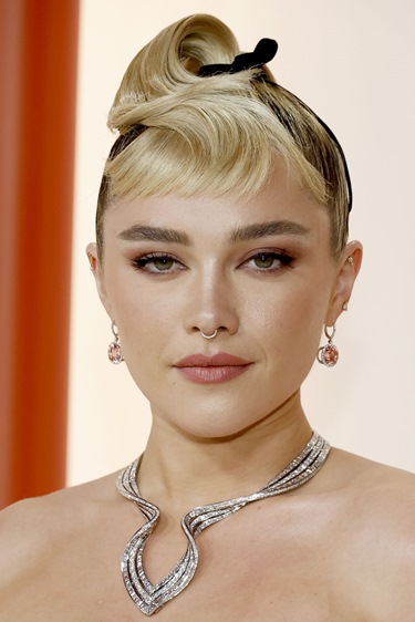 أضافت فلورنس باف أيضًا شريطًا أسودًا إلى تسريحة شعرها الغريبة مع غرّتها الصغيرة. كان مكياجها الوردي أحادي اللون مثيرًا ومتطورًا