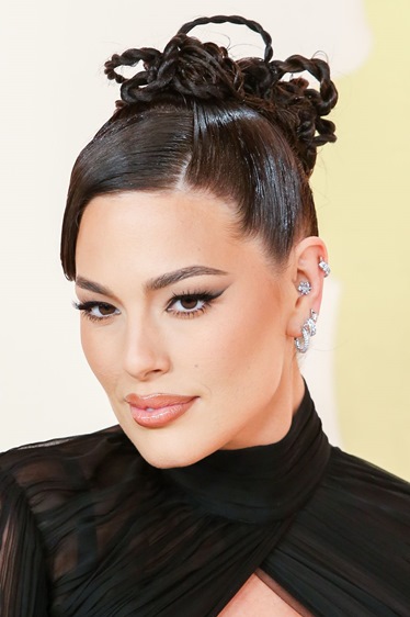 تم استكمال تسريحة آشلي جراهام المعقدة المضفرة بواسطة الآيلاينر الغرافيكي، مما يعكس الزوايا الموجودة في شعرها