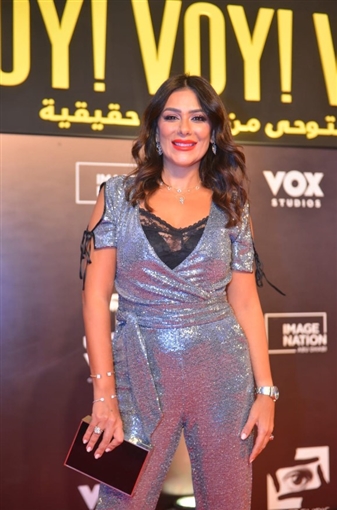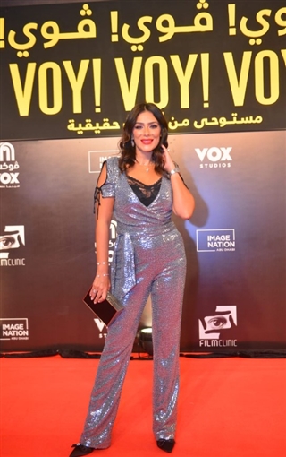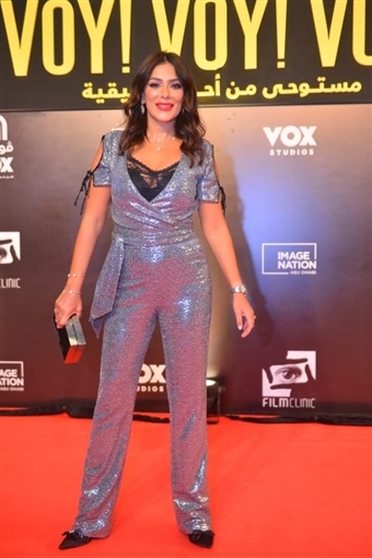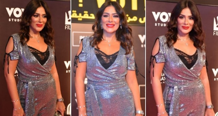 ارتدت إنجي المقدم "جامبسوت" من اللون الفضي وتركت شعرها منسدلا على الأكتاف.