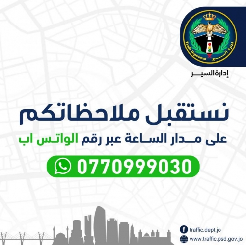 الرأي نيوز - دعت إدارة السير، المواطنين في حال مشاهدتهم لأي مخالفات مرورية سلوكية خطيرة تمريرها بشكل فوري على شكل فيديو أو صور على رقم واتساب (0770999030) الخاص بالشكاوى، مشيرة الى انه سيتم التعامل مع المعلومات بسرية تامة.