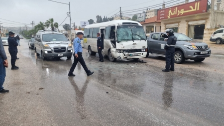 تعاملت كوادر دفاع مدني إربد، الثلاثاء، مع حادث تصادم بين حافلة ركاب عمومية وشاحنة في منطقة إيدون على طريق إربد عجلون، نتج عن الحادث 21 إصابة، وفق محافظ إربد رضوان العتوم