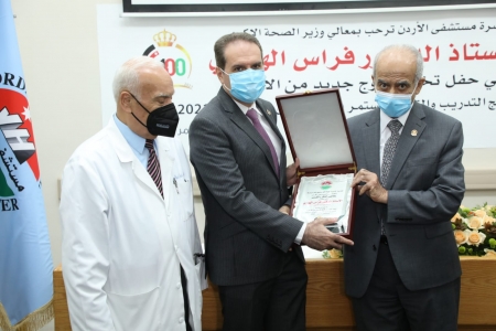 وقام وزير الصحة بختام الحفل يرافقه مدير عام مستشفى الاردن ومدير التدريب والتعليم الطبي ورؤساء البرامج التدريبية في الاقسام المختلفة بتوزيع شهادات التخريج على الفوج الجديد كما قدم الدكتور عبد الله البشير درعاً تكريمياً لوزير الصحه تقديراً لجهوده في دعم مسيرة القطاع الطبية ورعاية تخريج الفوج الجديد من الأطباء.