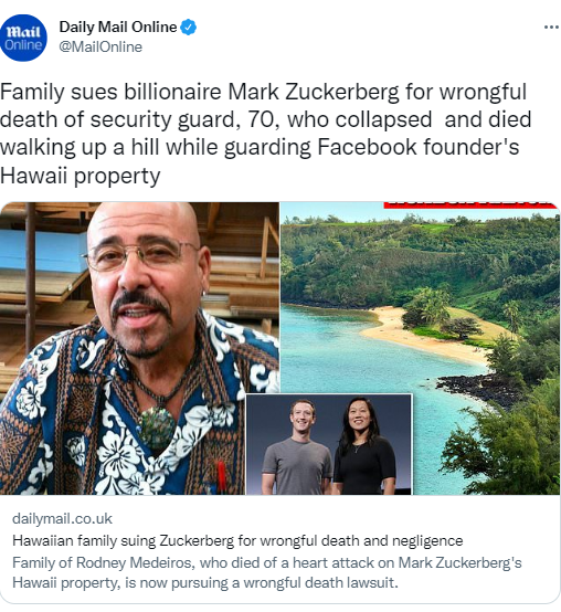 تقاضي الأسرة الآن شركة Pila Land LLC المملوكة لزوكربيرج بتهمة الإهمال والموت الخطأ، حيث عانى رودني ميديروس، 70 عامًا، من نوبة قلبية أثناء عمله كحارس أمن موسمى بدوام جزئى في منتجع Meta CEO ، المعروف باسم Koolau Ranch ، فى أغسطس 2019.