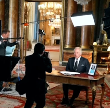 وفى مقطع فيديو الجديد الصادر عن القصر، يظهر الملك تشارلز في اللحظات التى سبقت وبعد إلقاء خطابه حيث تم تنظيم الكاميرات والإضاءة من حوله، وتُظهر اللقطات تشارلز جالسًا على مكتب في قصر باكنجهام، بينما يلتقط مصور ملكي صورة للمناسبة التاريخية.