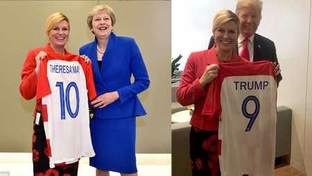 وفعلت رئيسة كرواتيا الموقف ذاته مع رئيسة وزراء إنجلترا تيريزا ماي، التي بدت مبتسمة خلال الصورة التذكارية. وكان قميص ماي يحمل رقم 10.