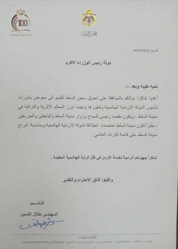 طالب النائب المهندس طلال النسور الحكومة بتحويل سجن السلط القديم إلى بانوراما الدولة الاردنية الهاشمية تجسد فيها تأسيس الدولة ونهضتها وتطورها وايضا يتخلل البانوراما المعالم التراثية والمعمارية والعادات والتقاليد في مدينة السلط خاصة بمناسبة ادارجها على قائمة التراث العالمي ( السلط مدينة التسامح والضيافة الحضرية) ويكون هذا الصرح التاريخي مقصد لزوار المدينة ويحكي تاريخ الدولة الاردنية بطريقة حديثة ومعبره ويكون ايضا مقصد رئيسي للباحثين والمورخيين.