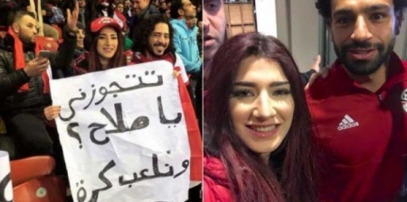 تداول ناشطون على مواقع التواصل صوراً لشابة مصرية كانت تجلس في مدرجات الجماهير المصرية خلال مباراة منتخبها الوطني مع البرتغال، ورفعت لافتة تطلب فيها الزواج من محمد صلاح، وكتبت فيها باللهجة المصرية "تتجوزني يا صلاح ونلعب كرة".
