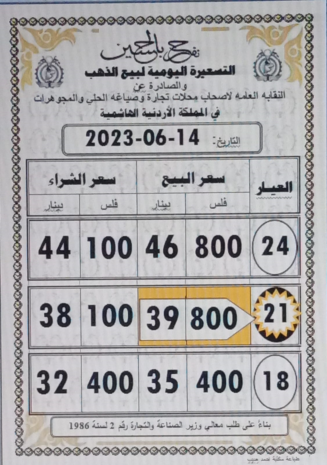 و بلغ سعر غرام الذهب من عيار 21 وهو الأكثر رغبة لدى الأردنيين 39،80 دينارا للبيع للمواطنين، و38،10 للشراء من المواطنين