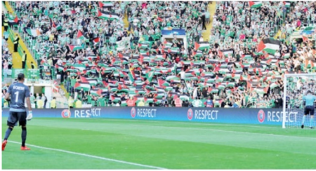 ومنذ بدء معركة "طوفان الأقصى"، تقف جماهير نادي سلتيك الاسكتلندي مؤازرة للشعب الفلسطيني في نضاله للتحرر من الاحتلال، وذلك من خلال مواصلة رفع الأعلام الفلسطينية في مباريات النادي التي يخوضها في المسابقات المحلية والأوروبية وحتى تلك التي تقام في مسرح الأحداث العالمي
