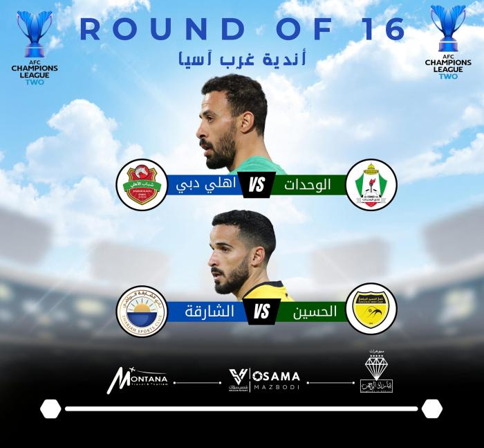 الراي نيوز -  أفرزت قرعة الدور ثمن النهائي من دوري أبطال آسيا 2 صباح الخميس، عن لقاء الوحدات نظيره شباب الأهلي دبي الإماراتي، فيما يواجه الحسين إربد نظيره الشارقة الإماراتي.