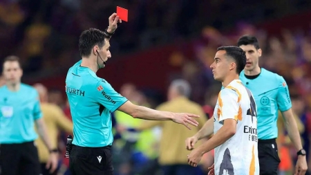 الراي نيوز -  يواجه ثلاثي ريال مدريد أنطونيو روديغر، ولوكاس فاسكيز، وجود بيلينغهام، أزمة قوية بعد حصولهم على كروت حمراء والطرد خلال مواجهة برشلونة، التي جمعت الفريقين، مساء أمس السبت، ضمن منافسات نهائي كأس ملك إسبانيا.