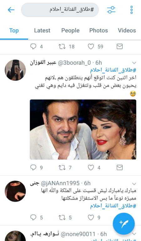 أشعل خبر طلاق الفنانة أحلام من زوجها مبارك الهاجري، الذي تم تداوله تحت هاشتاغ "طلاق أحلام" موقع "تويتر" في وقت كان الزوجان يمضيان فترة نقاهة عائلية في باريس، بعد الحفل الذي أحيته أحلام في المغرب، وقبل توجّهها الى الولايات المتحدة الأميركية لإحياء حفلها المرتقب هناك في 21 من شهر تموزيوليو الجاري.