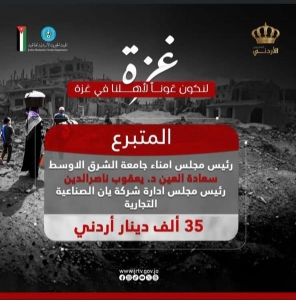 الرأي نيوز  - عمّان – ساهمت جامعة الشرق الأوسط وشركة "يان" الصناعية التجارية بـ 35 ألف دينار؛ لمساندة الأشقاء في قطاع غزة لما يتعرضون له من عدوانٍ إسرائيليّ مكثف، وتجسيدًا للالتزام بالمسؤولية المجتمعية محليًا، وإقليميًا، وإبرازًا للمبادرة النبيلة في إحداث تأثيرٍ إيجابي على العالم.