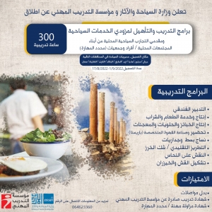 وبين أن البرامج تنقسم إلى مسارين، الأول برنامج التدريب والتأهيل لمزودي الخدمات السياحية ومقدمي التجارب السياحية المحلية من أبناء المجتمعات المحلية وأفراد الجمعيات بواقع 300 ساعة تدريبية وتشتمل على برامج التدبير الفندقي، وإنتاج وخدمة الطعام والشراب، وإنتاج الخبائز والحلويات والمعجنات، وتحضير وصناعة القهوة، ونساج بسط وجداريات، والتطريز التقليدي، والنقش على النحاس والذي يستهدف الشباب والشابات الأردنيين ضمن الفئة العمرية 18- 30 سنة بالمحافظات المستهدفة.