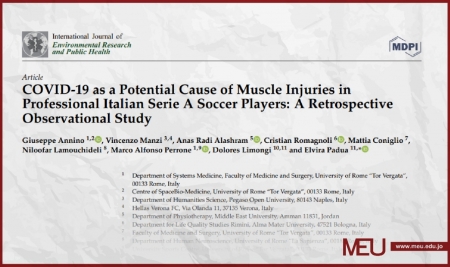 وفي هذا الصدد، قام عميد كلية العلوم الطبية المساندة في الجامعة الدكتور أنس الأشرم، بالتعاون مع باحثيين ايطاليين في جامعات إيطالية بإجراء دراسة عنوانها (جائحة فايروس كورونا (كوفيد 19) كسبب محتمل لإصابات العضلات عند لاعبي كرة القدم المحترفين في دوري الدرجة الأولى الإيطالي).